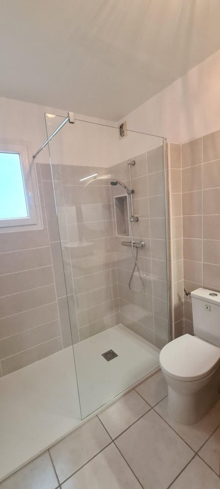 Il a modifié la vidange de la douche pour l'encastrement au ras du sol du receveur et a installé une paroi de douche fixe.