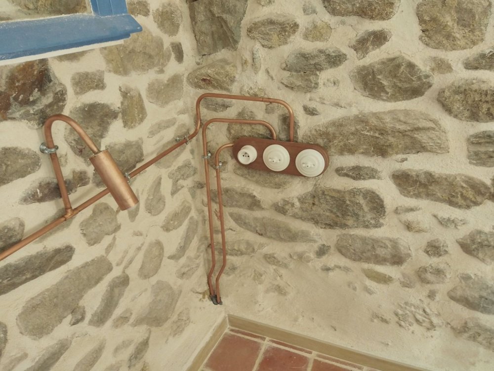 Nous avons refait les sols intérieurs avec un sytème de drainage, radier, dalle béton, chappe et pose de cayrou et de carreaux de ciment. Nous avons repris les murs en pierre apparentes, les cloisons de distribution en brique et plaque de plâtre, les faïences, les peintures, la plomberie (alimentation eau froide sanitaire, eau chaude sanitaire et les vidanges), le tableau électrique, toute l'électricité dont une partie en cuivre dans la chambre pour le passage des réseaux, la pose d'une VMC.